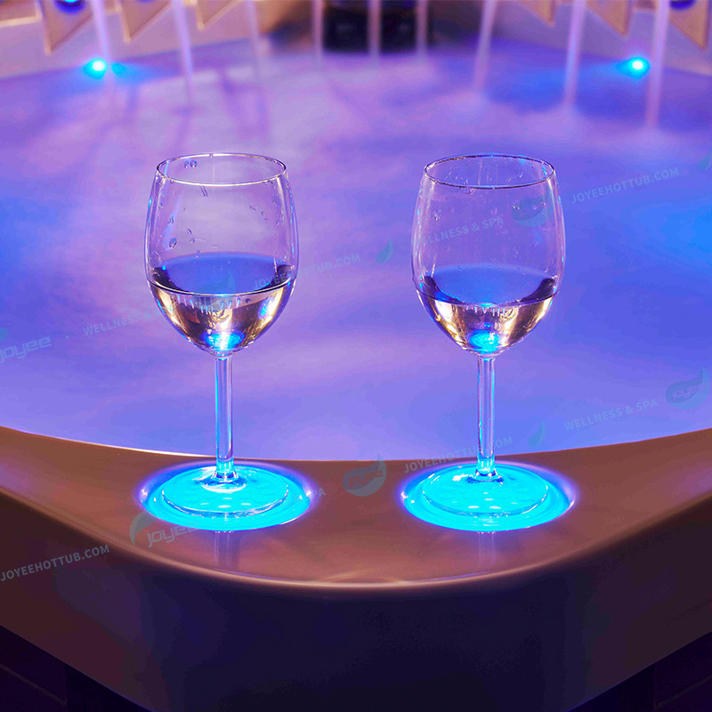 Размеры бассейна около 210×210 см позволяют комфортно разместить до 5 человек, включая лежачие и сидячие места.